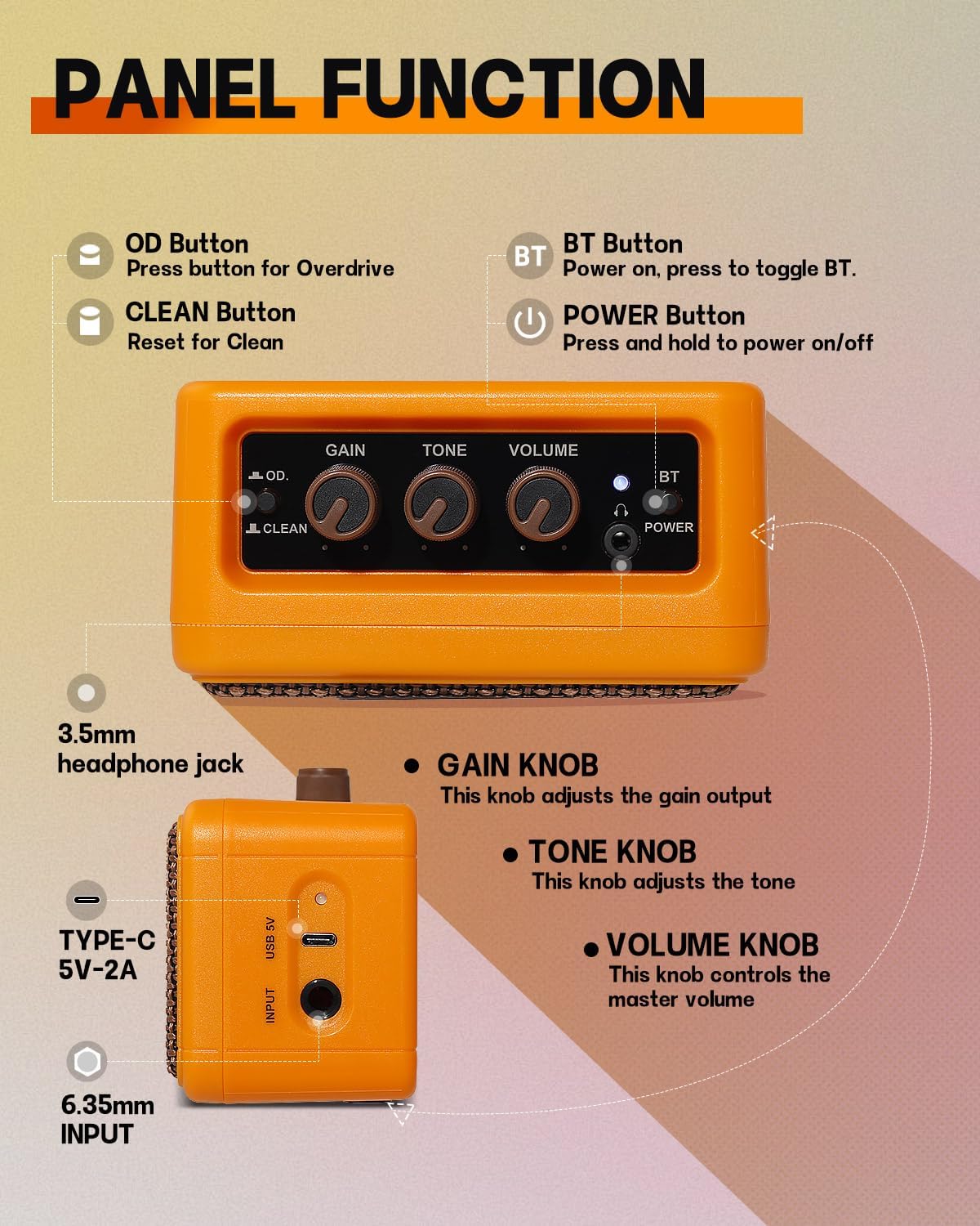 Mini Guitar Amplifier - 5W Dual Speaker BT Wireless Guitar Amp, Rechargeable Battery, Clean/Overdrive Modes, Headphone Jack,Ideal for Practice or Performance (Orange)