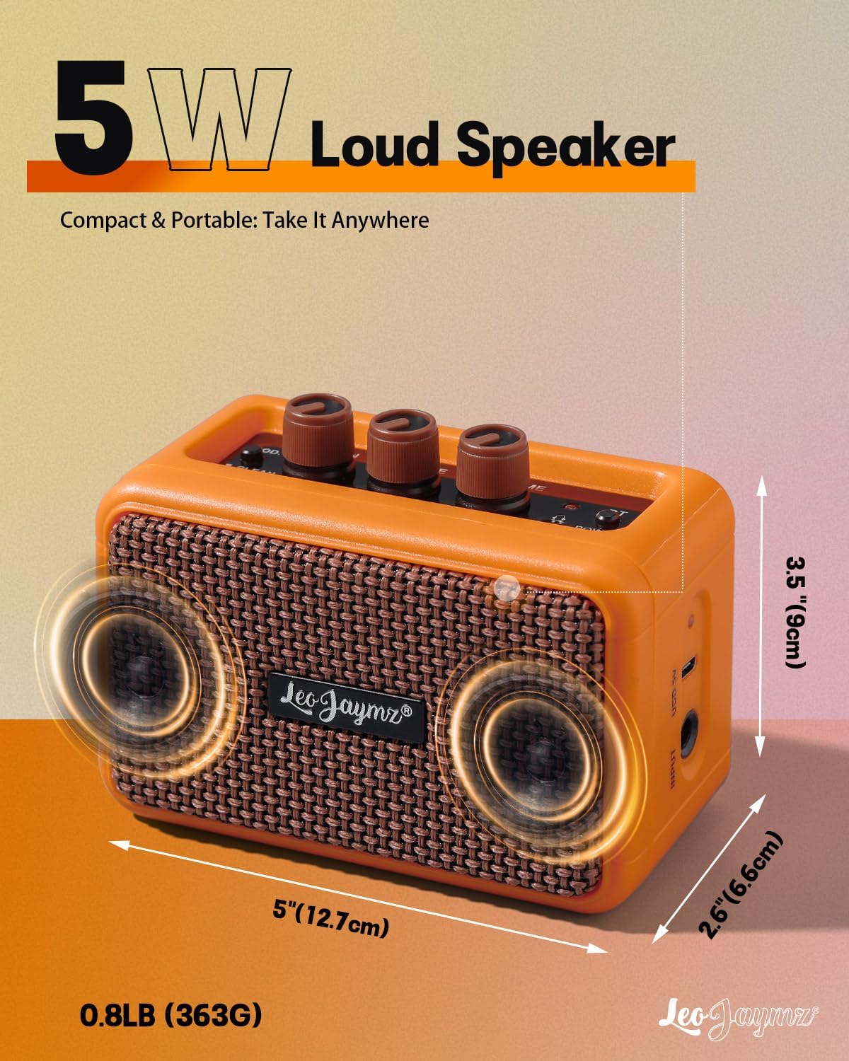 • Ultra-Portable Design: Compact and lightweight at just 0.8lb (362g) and measuring 5 x 2.6 x 3.5 inches (12.7 x 6.6 x 9 cm), this mini amp fits perfectly into your gig bag—ideal for musicians on the move.