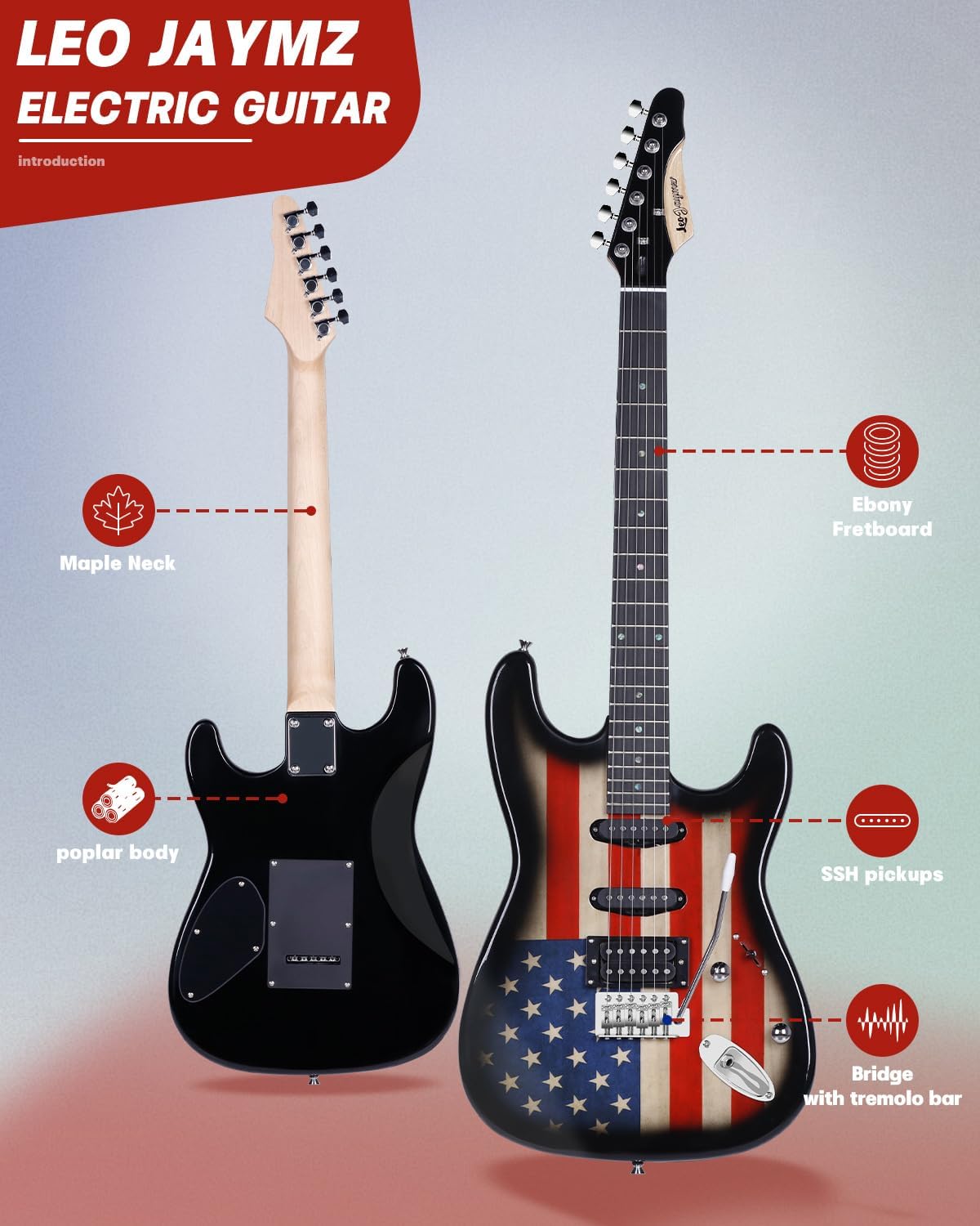 Leo Jaymz 39“ Full Size ST Style Electric Guitar Starter Kit with SSH Pickup, 5W Portable Amp, Tuner, Gig Bag, Strap or Accessories (US Flag)