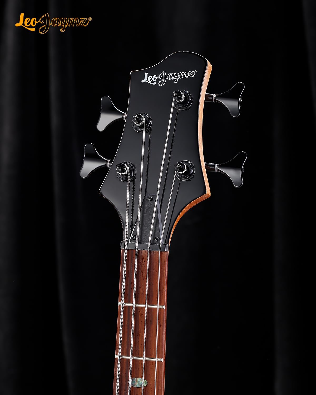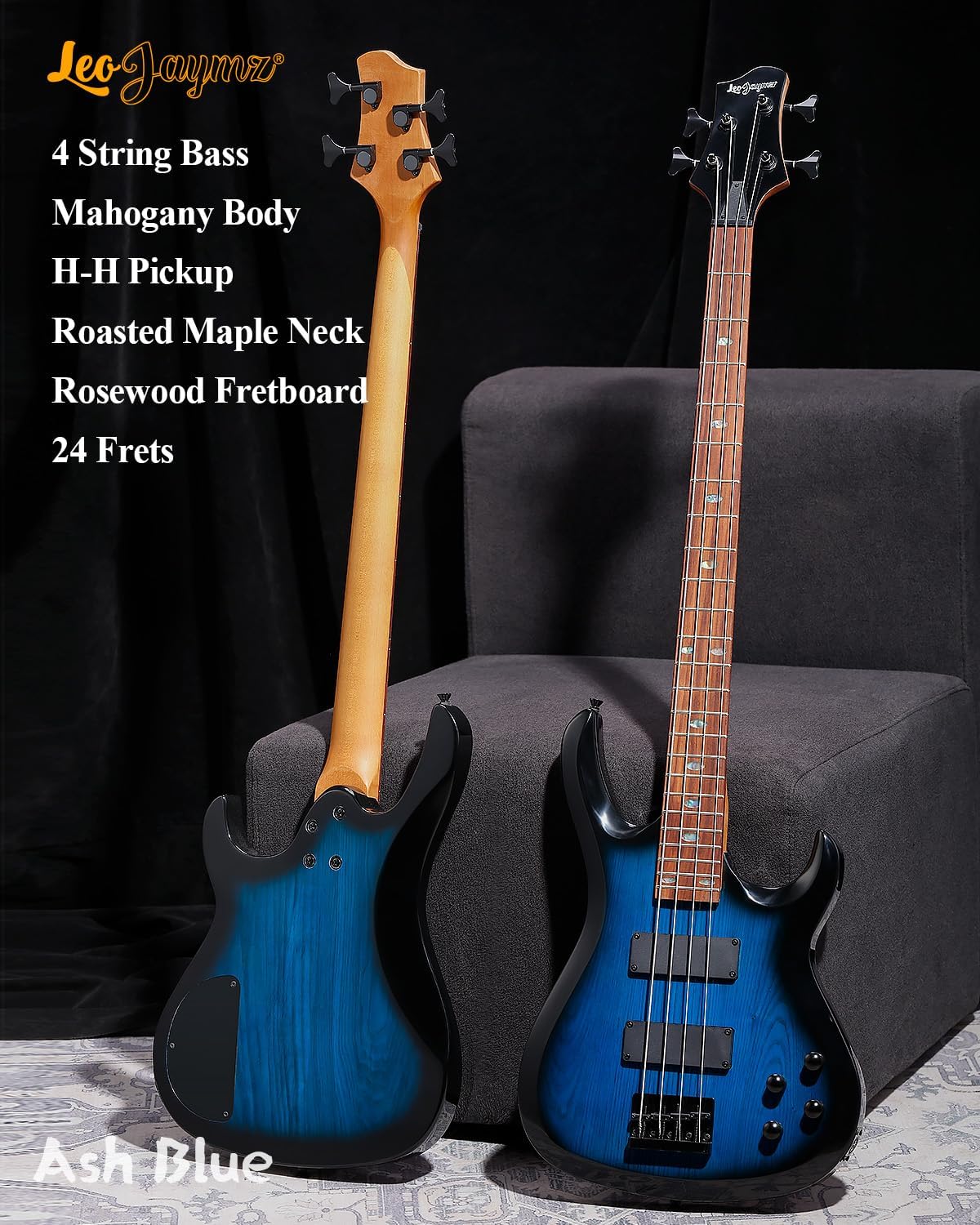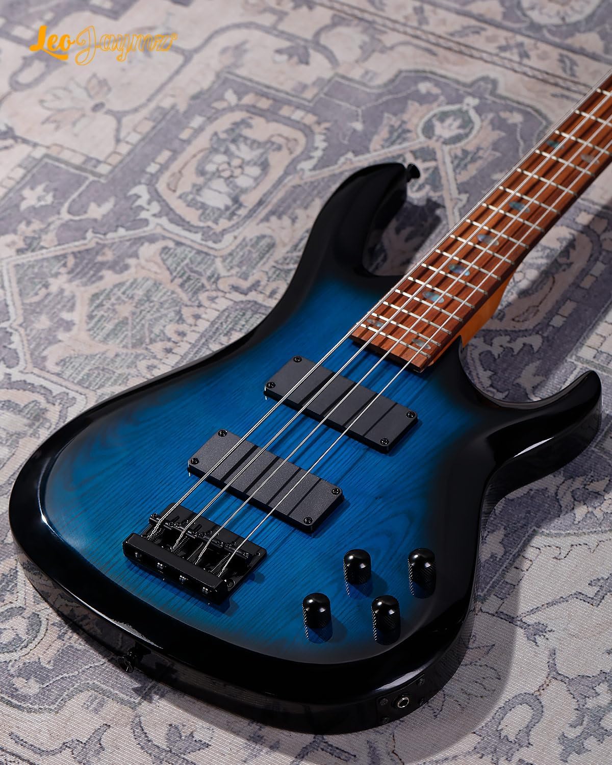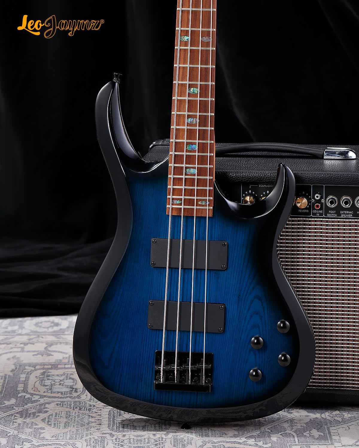 Leo Jaymz CB-400 4 String 34” Electric Bass Guitar, 24 Frets, Mahogany Body and Ash Veener, Rosewood Fingerboard with Abalone Inlays, Roasted Maple Neck, H-H Pickups, Glossy Body Finish (CB ASH Blue)