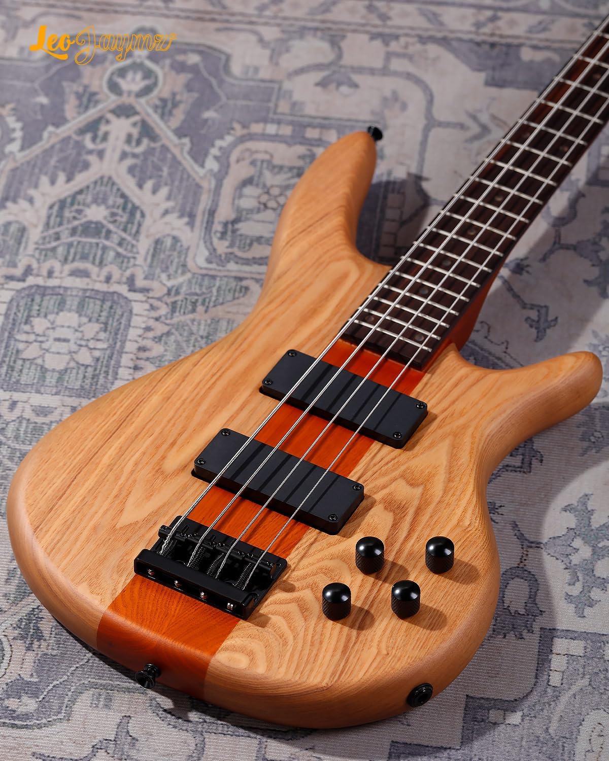 Leo Jaymz CB-400 4 String 34” Electric Bass Guitar, 24 Frets, Mahogany Body and Ash Veener, Rosewood Fingerboard with Abalone Inlays, Roasted Maple Neck, H-H Pickups, Glossy Body Finish (CB ASH Blue)