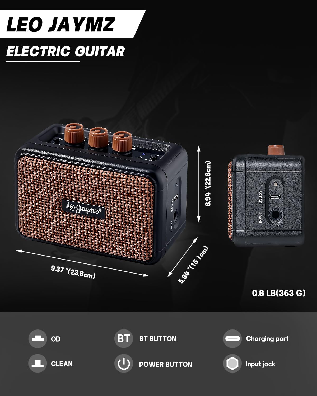 Mini Guitar Amplifier - 5W Dual Speaker BT Wireless Guitar Amp, Rechargeable Battery, Clean/Overdrive Modes, Headphone Jack,Ideal for Practice or Performance (Black)